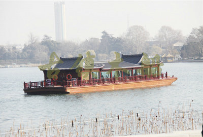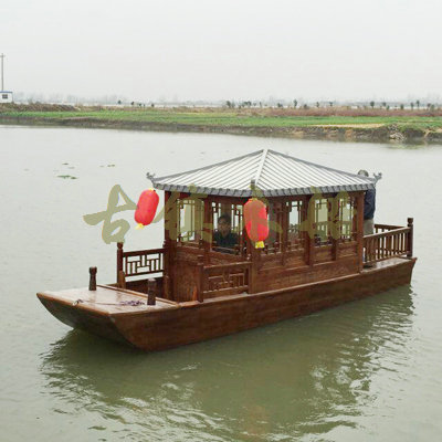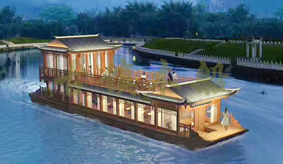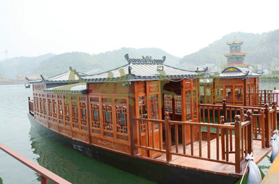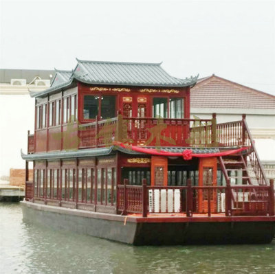 畫舫船就是裝飾古典華麗的游船,是"中國風"的仿古游船,結合古典園林建筑,體現了中華文明的古典藝術.畫舫船豪華而又古典,船上的建筑按照中國古代建筑里的亭臺樓閣,建筑工藝之復雜,要求之嚴格,仿古畫舫游船的特點飛檐翹角、玲瓏精致的四角亭子逐漸成形,赫然立于船頭,美人靠、盤龍柱子、彩畫……龍柱上的浮雕盤龍和祥云一層扣著一層,層層錯落有致,雕刻精細到盤龍身上的每一個鱗片都細細可數,古代皇家標志性元素,在畫舫船上體現的淋漓盡致。除了雕刻、花窗,整條船還有一個看點,那就是弧線優(yōu)美、高高翹起的船尾。游船并不大,長約10米、寬3米,但是整體看起來堪稱一件藝術品。船尾的雕花欄桿與船艙、船頭的雕刻遙相呼應,船身四周貼著浮雕祥云,給整條船增添了富貴、華麗的氣質。